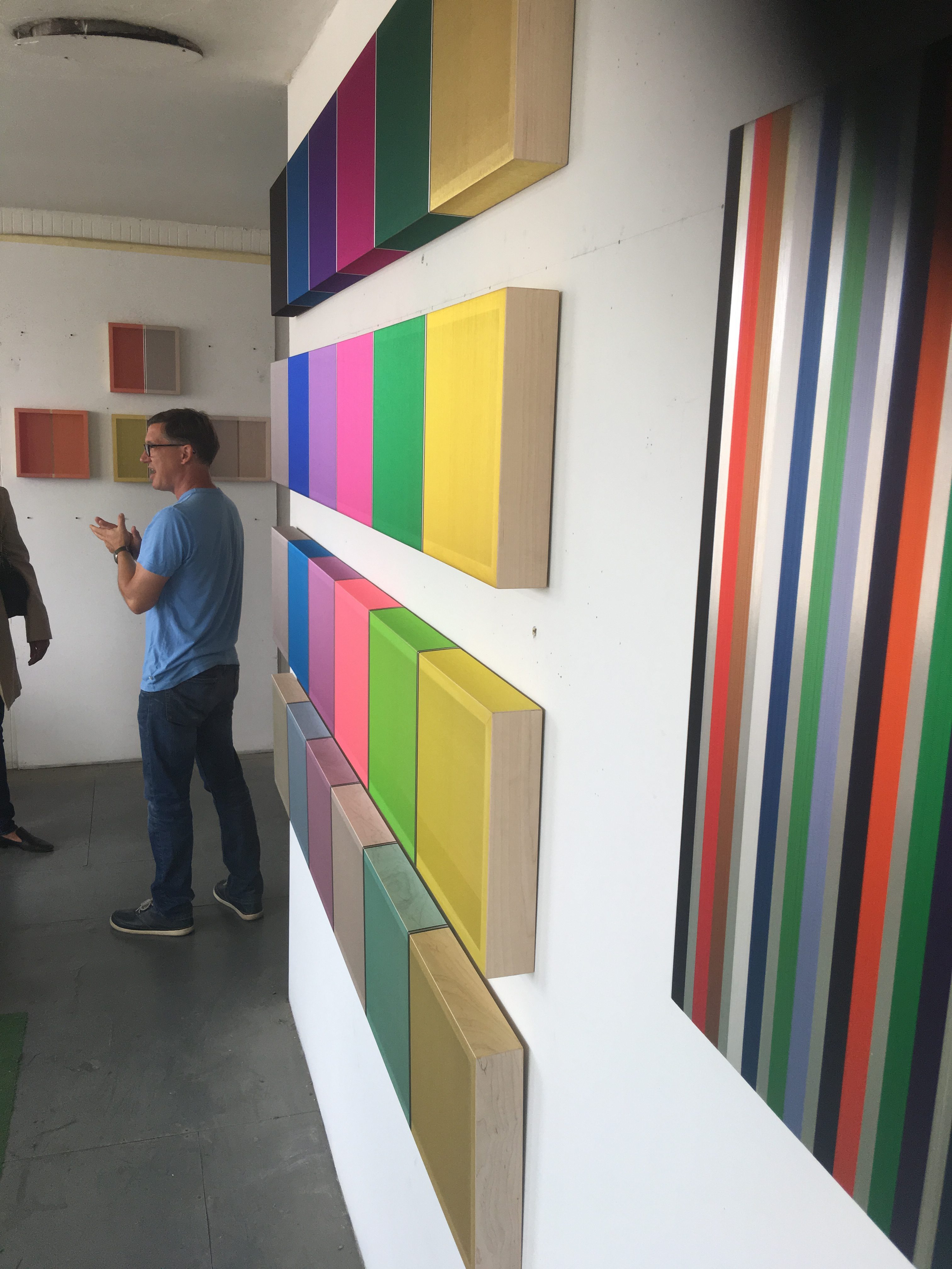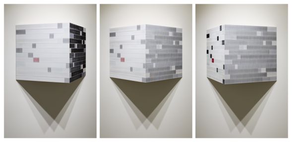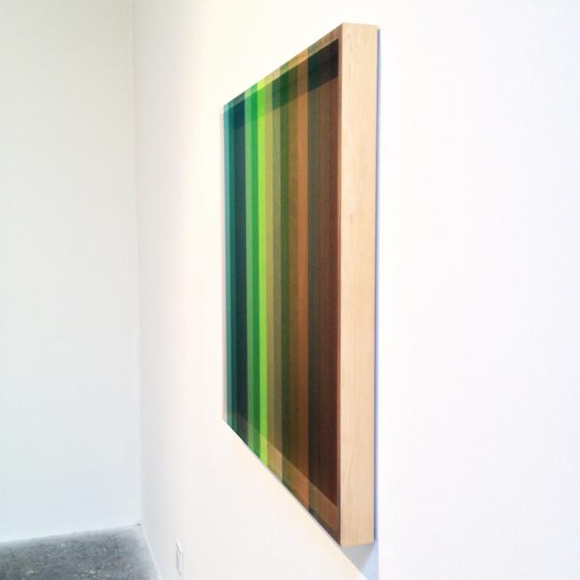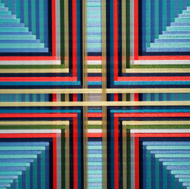 Ce qui est assez impressionnant dans son art, c’est l’effet d’optique et sa manière de se référer à des techniques se rapprochant de l’Artisanat. Par exemple, pour certaines de ses œuvres, il travaille sur des caissons de bois, où il tire des centaines de fils de couleurs parfaitement alignés et, quand on est face à l’oeuvre, les couleurs sont presque inexistantes, pastelles très claires, puis suivant l’angle que l’on prend, les couleurs apparaissent puissantes, vives… C’est aussi sublime qu’incroyable !